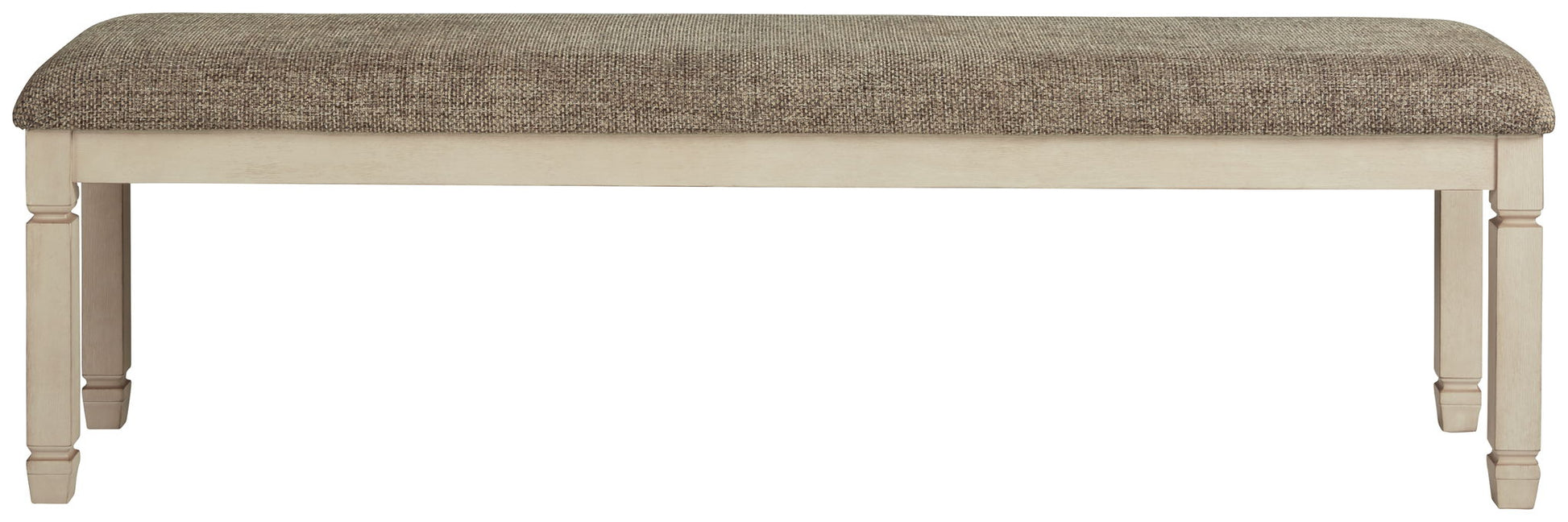 The beauty of this upholstered dining bench is something to savor. Serving up country cottage comfort and fresh farmhouse flair, the generously-scaled bench entices with a cushioned seat covered in a heavy woven fabric that complements the trendy textured, antiqued white finish.