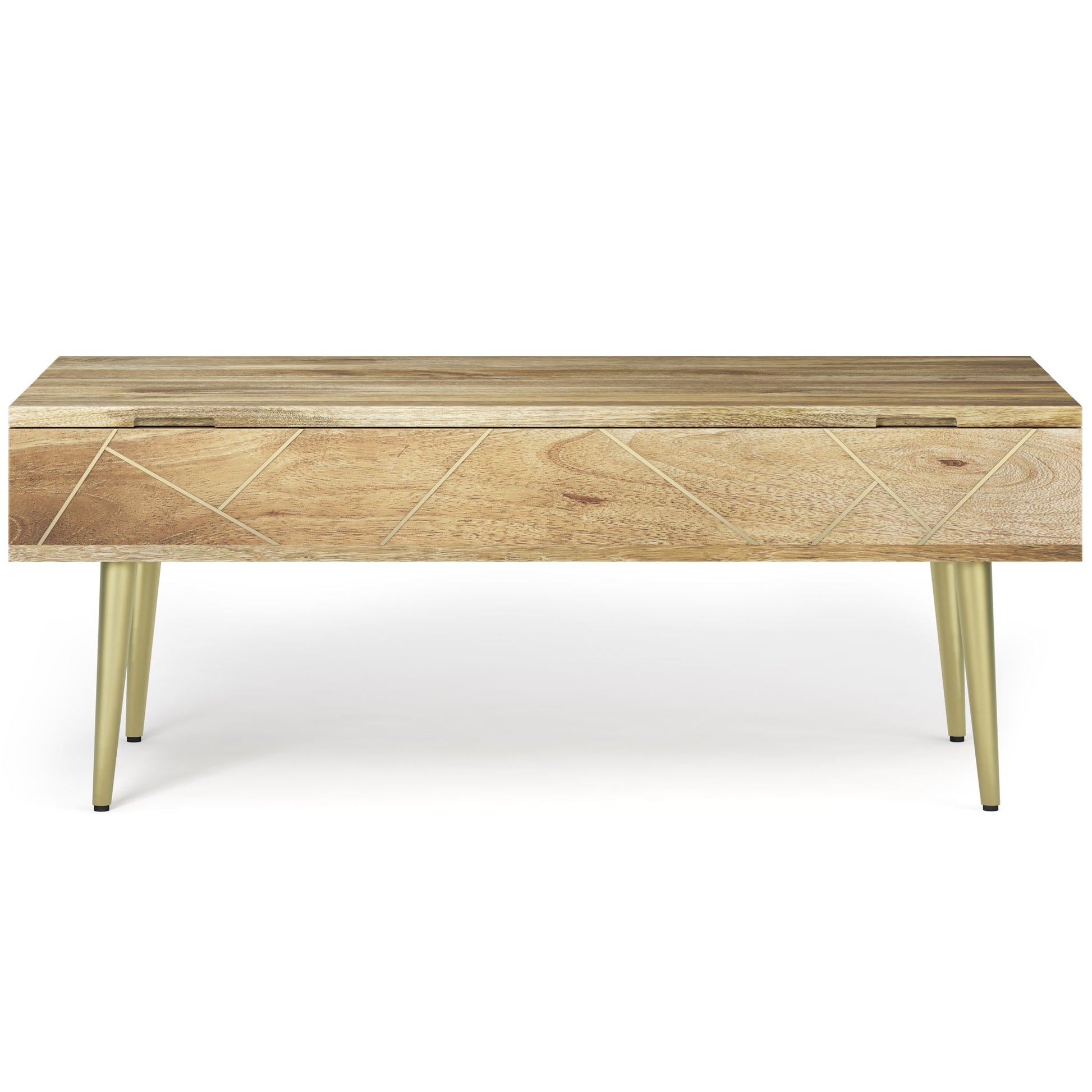 - Features lift top with large storage space and four angled metal legs in a gold finish
