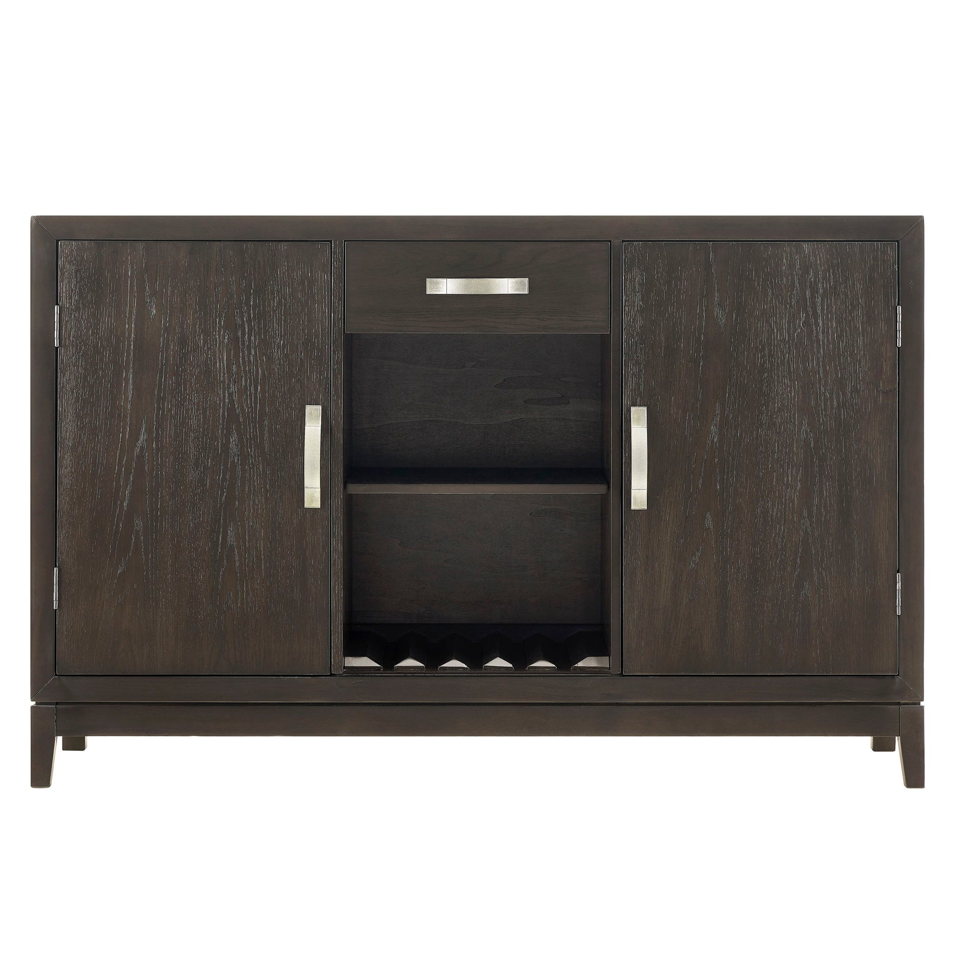 Enhance your dining or living space with this sophisticated and functional storage solution. Designed with a sleek, modern aesthetic, it features a rich, dark finish that exudes elegance while complementing a variety of décor styles. The spacious cabinets provide ample room for dinnerware, glassware, or entertaining essentials, while the open shelving is perfect for displaying your favorite bottles and décor accents. A convenient drawer adds extra storage for smaller items, keeping your space organized and clutter-free. Accented with stylish metal hardware, this piece effortlessly combines practicality with timeless charm, making it the perfect addition to any home.