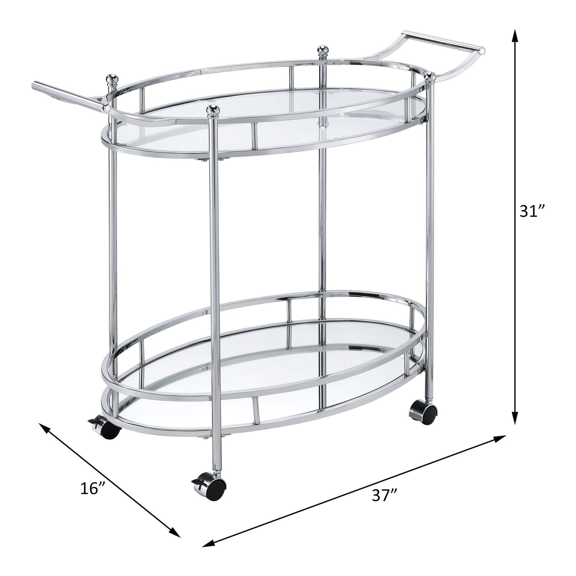 - Luxurious Touch: The gleaming chrome frame adds a luxurious touch, and the clear glass shelves let your displayed items take center stage, enhancing the cart's overall aesthetic appeal.