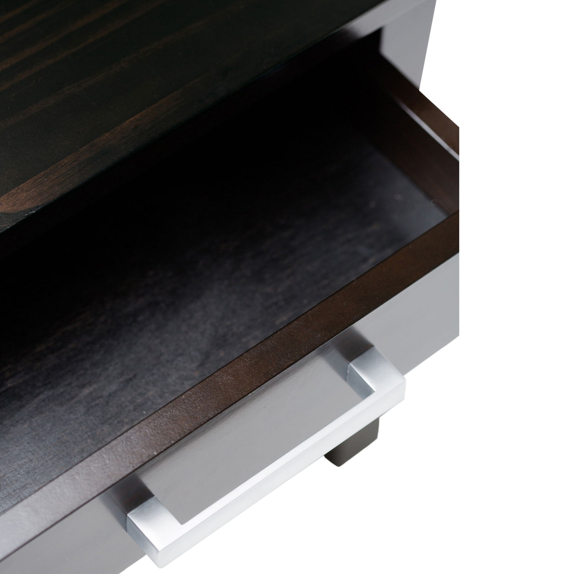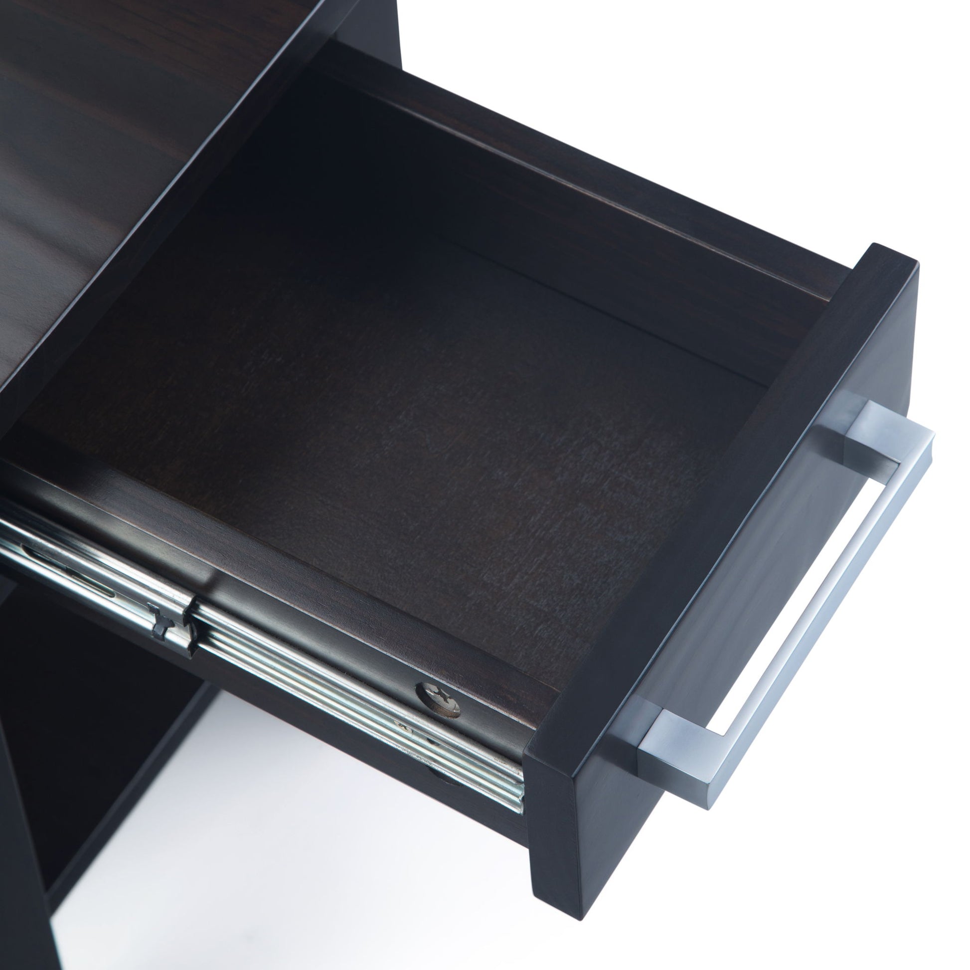 - Features one large drawer with metal drawer glides and an open bottom shelf providing ample storage space.
