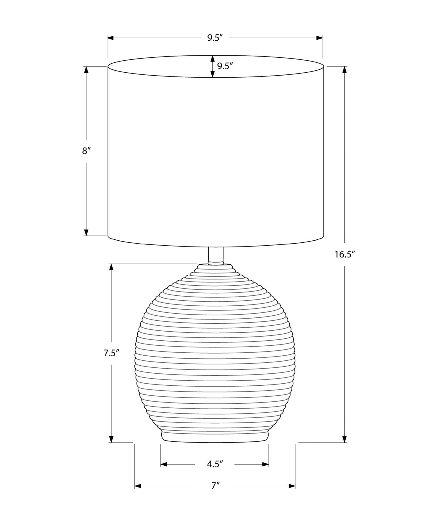 - Product Dimensions: Overall dimensions are 9.5" L x 9.5" W x 16" H with a base of 7" L x 7" W x 7.5" H and a shade of 9.5" L x 9.5" W x 8" H.
