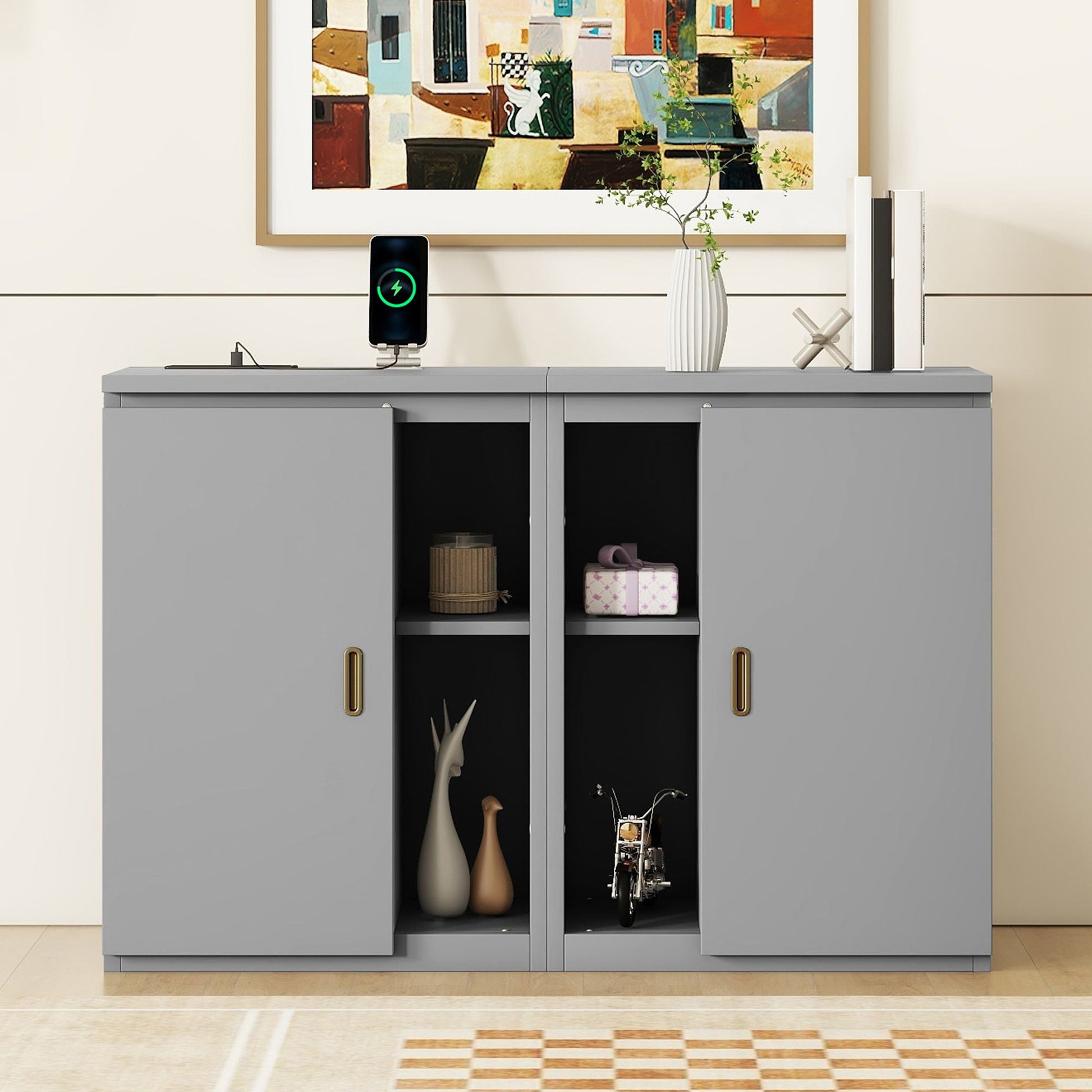 Queen Size Murphy Bed With Shelves, Cabinets And USB Ports - Gray